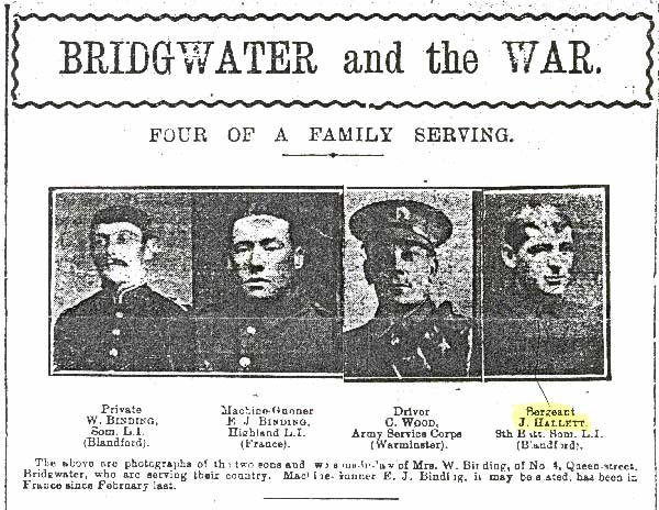 Photographs of Private W Binding (Som LI), Machine Gunner EJ Binding (Highland LI), Driver C Wood (Army Service Corps) & Sergeant J Hallett (9th Batt Som LI). All are stated as being the sons or sons-in-law of Mrs W Binding of No 4, Queen Street, Bridgwater.